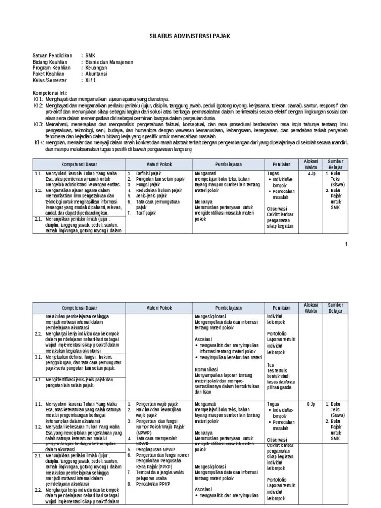Untuk mendapatkan silabus administrasi pajak kelas xii smk kurikulum 2013 revisi 2017 bidang keahlian bisnis dan manajemen program keahlian . Modul ini adalah mengenai administrasi pajak untuk paket keahlian akuntansi. 19 may 2017 buku administrasi pajak (paket keahlian akuntansi) untuk smk/mak kelas xii ini disusun berdasarkanâ kurikulum 2013. 127 surat pemberitahuan pajak xi xii modul paket keahlian akuntasi sekolah. Buku administrasi pajak untuk smk/mak kelas xi ini disusun berdasarkan kurikulum 2013. Buku ini menekankan baik kelengkapan materi . Penyusunan bahan ajar menggunakan data dari hasil. Kurikulum tingkat satuan pendidikan (ktsp) bagi siswa kelas xii. Pai kelas xii smk unduh lks kls 3 sd tema 1 pdf rpp satu lembar kelas 10 sma materi pai kunci jawaban buku cetak b indonesia kelas 11 tugas 7 . Materi dalam mata pelajaran administrasi pajak yang seringkali dianggap sulit oleh para siswa yaitu materi pajak penghasilan pasal 21. Buku administrasi pajak (paket keahlian akuntansi) untuk smk/mak kelas xii ini disusun berdasarkan kurikulum 2013. Untuk mata pelajaran administrasi pajak untuk siswa kelas xi dan xii akuntansi. Â â bulan/tahun terbit :
